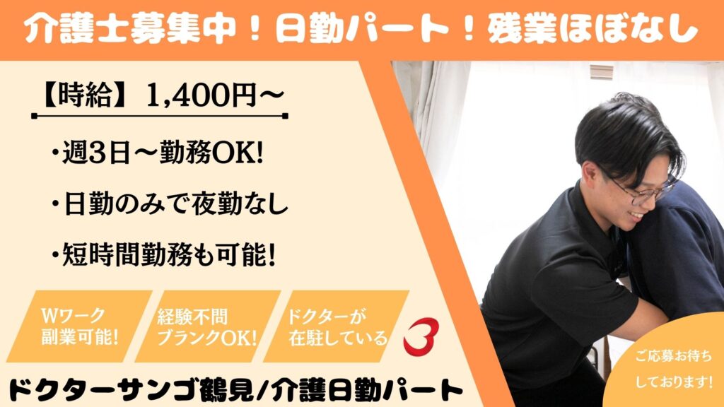 【パート】介護スタッフ募集|未経験・ブランクOK!日勤のみ/週2日〜OK|ドクターサンゴ 鶴見(大阪市鶴見区)