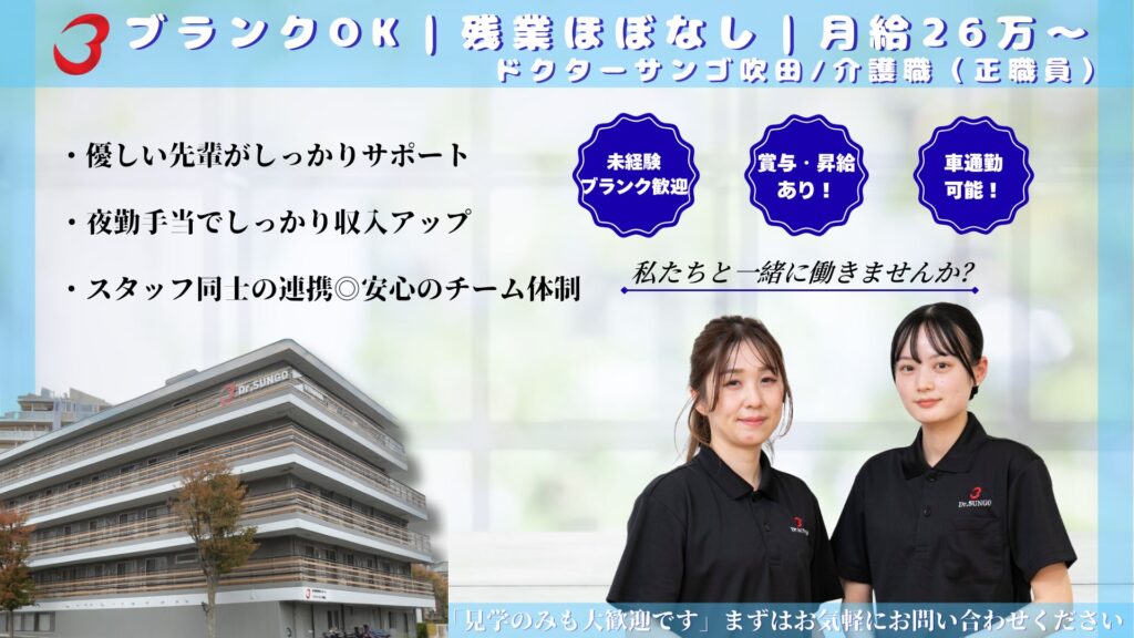 【正社員】介護スタッフ募集|未経験・ブランクOK!夜勤あり/ドクターサンゴ 吹田(吹田市)
