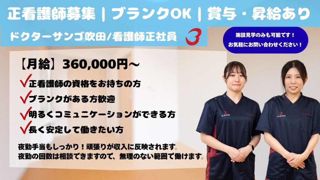 【正社員】看護スタッフ募集|未経験・ブランクOK!夜勤あり/ドクターサンゴ 吹田(吹田市)