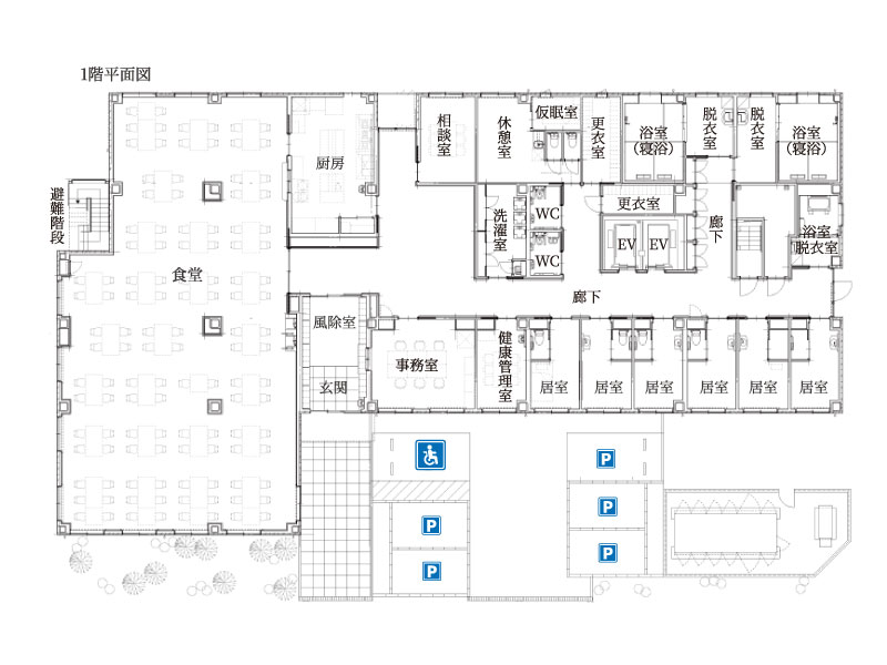 | 共用設備 | 一般浴室(11室)、機械浴室(2室)、車椅子用トイレ(2室)、洗濯機(13台)、食堂、健康相談室(1室)、駐車場(6台) |
